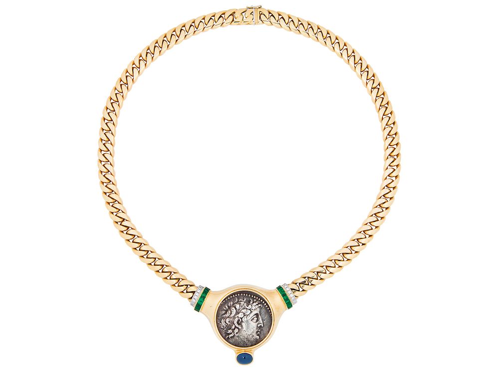 A Silver Coin Sapphire Emerald Diamond And Gold Necklace Toni Cave Lofty Marketplace